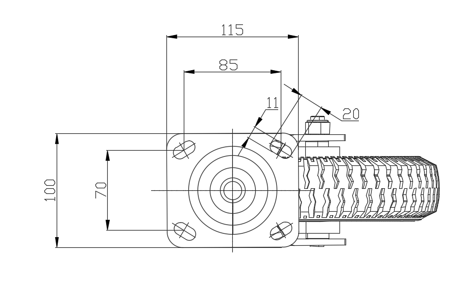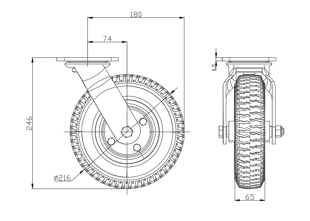 底板规格 115 x 100mm 底板孔距 85 x 70mm 底板孔径 20 x 11mm 偏心距 74mm 旋转干涉 360mm 总高 246mm 旋转半径 180mm 硬度 75±5° Shore A 荷重(动态) 100kgs |