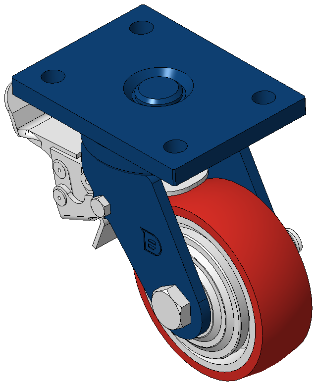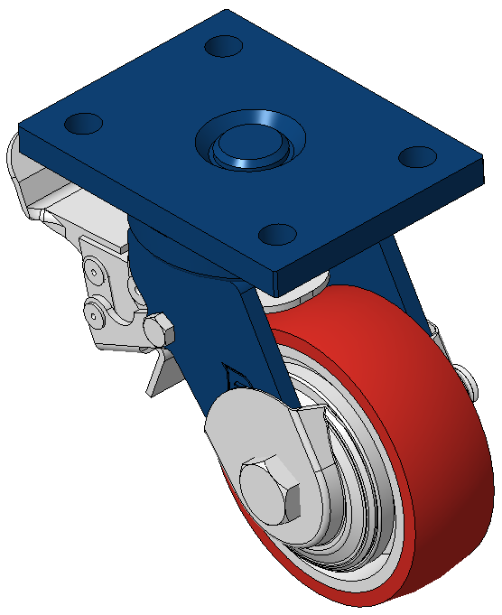 表面喷蓝漆,底板式安装装置,孔距90x60 铸铁制轮芯,高质量聚氨酯轮面,铣红色 轮子轴承—精密滚珠 |