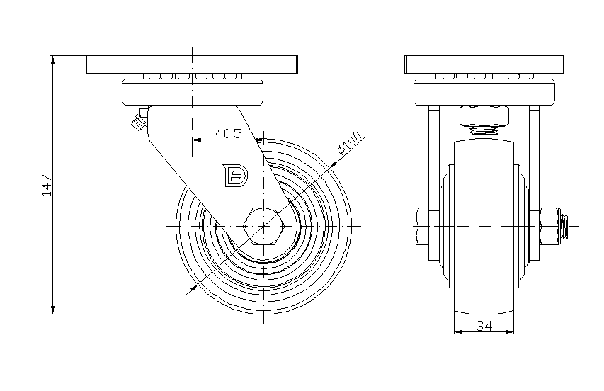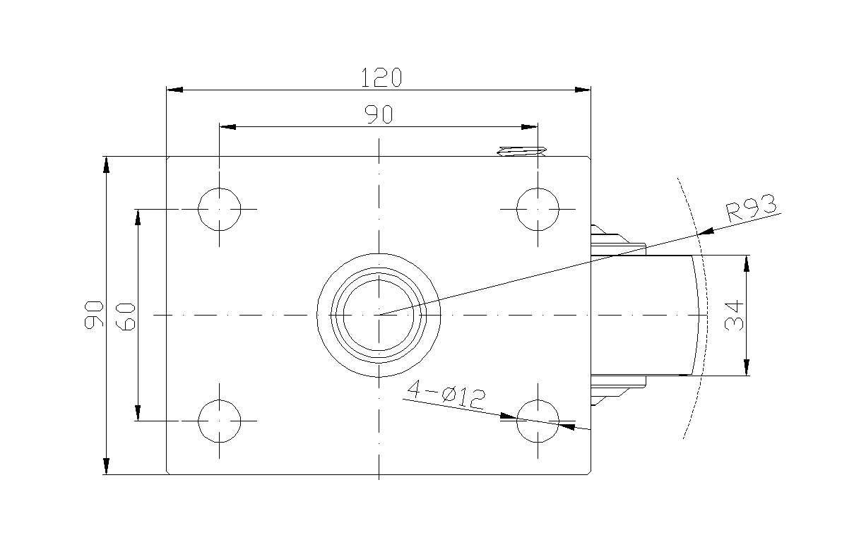 底板规格 120 x 90mm 底板孔距 90 x 60mm 底板孔径 12mm 偏心距 40.5mm 旋转干涉 186mm 总高 147mm 旋转半径 93mm 硬度 93±5° Shore A 荷重(动态) 250kgs |