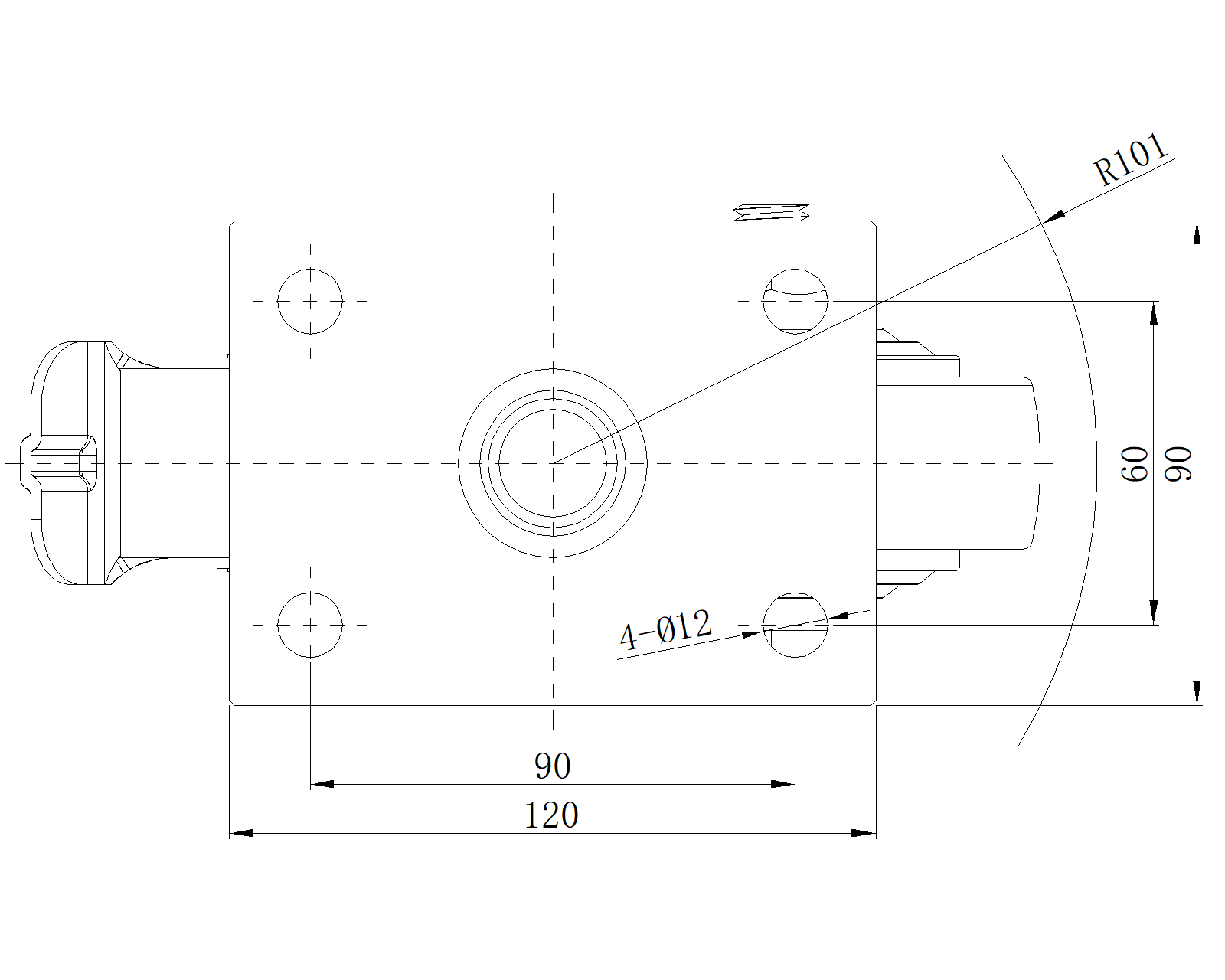 底板规格 120 x 90mm 底板孔距 90X60mm 底板孔径 12mm 偏心距 40.5mm 旋转干涉 202mm 总高 147mm 旋转半径 101mm 硬度 72±5° Shore D 荷重(动态) 200kgs |