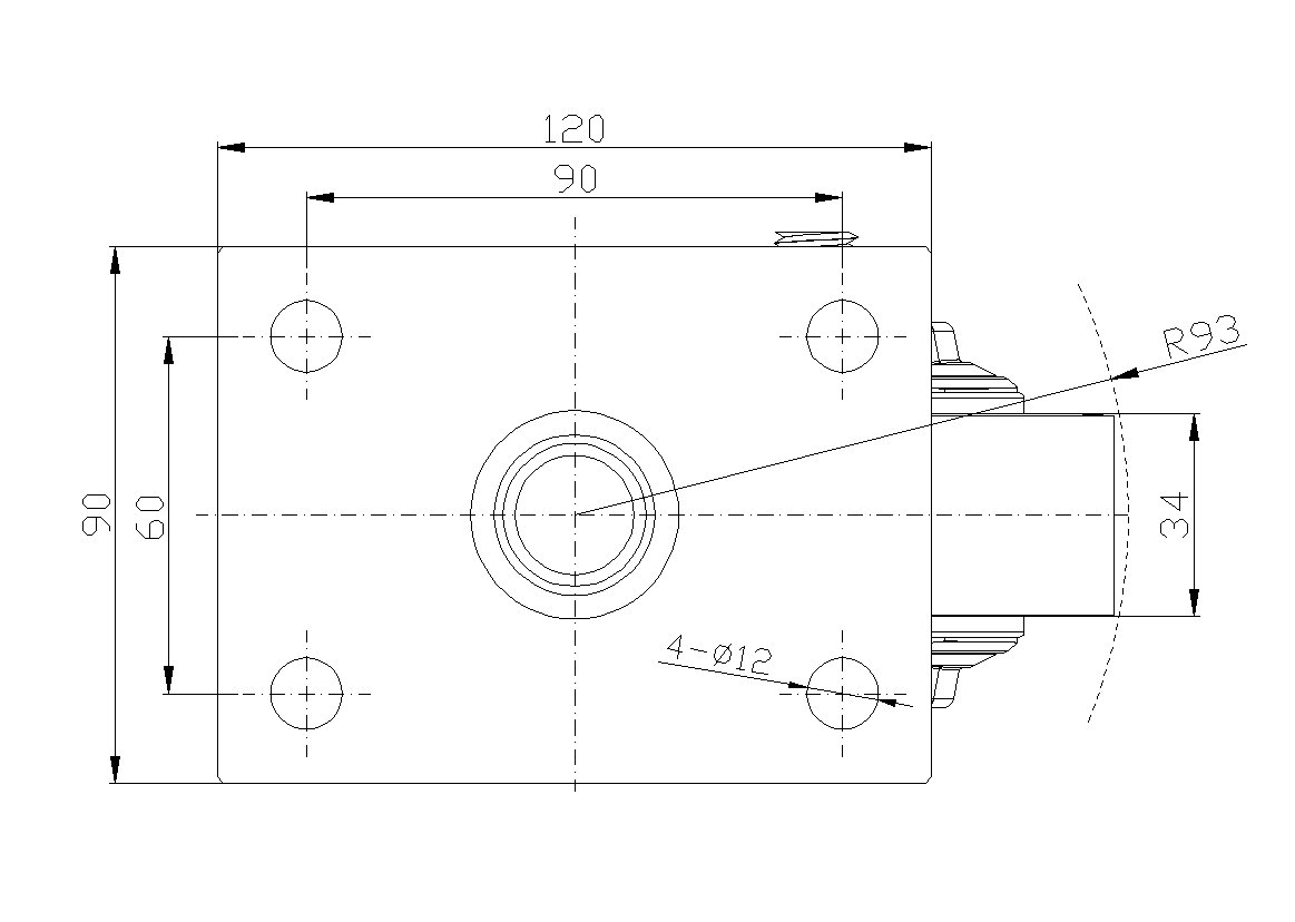 底板规格 120 x 90mm 底板孔距 90 x 60mm 底板孔径 12mm 偏心距 40.5mm 旋转干涉 186mm 总高 147mm 旋转半径 93mm 硬度 93±5° Shore A 荷重(动态) 250kgs |