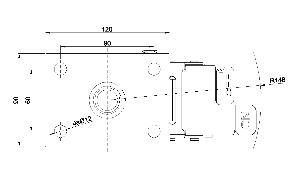 底板规格 120 x 90mm 底板孔距 90 x 60mm 底板孔径 12mm 偏心距 40.5mm 旋转干涉 296mm 总高 147mm 旋转半径 148mm 硬度 85±5° Shore A 荷重(动态) 200kgs |