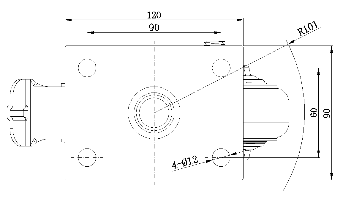 底板规格 120 x 90mm 底板孔距 90 x 60mm 底板孔径 12mm 偏心距 40.5mm 旋转干涉 202mm 总高 147mm 旋转半径 101mm 硬度 85±5° Shore A 荷重(动态) 200kgs |