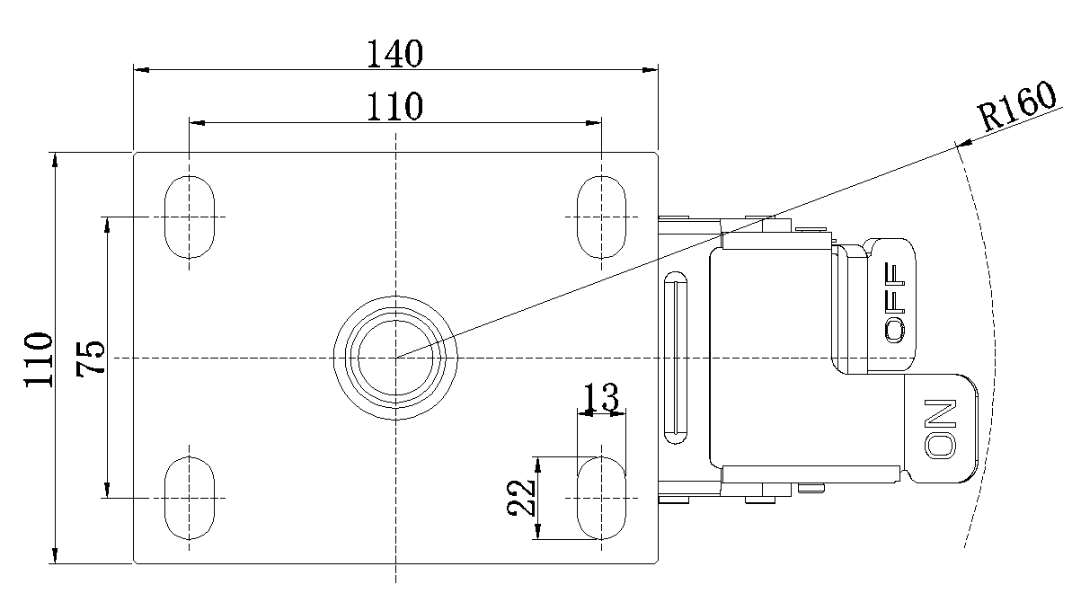 底板规格 140 x 110mm 底板孔距 110x75mm 底板孔径 22 x 13mm 偏心距 45mm 旋转干涉 320mm 总高 170mm 旋转半径 160mm 硬度 85±5° Shore A 荷重(动态) 250kgs |