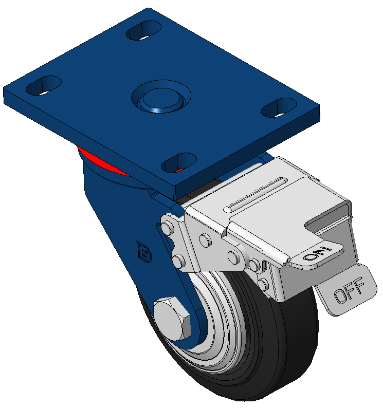 表面喷蓝漆,底板式安装装置,孔距110x75 铸铁制轮芯,高品质高弹性橡胶轮面 铣黑色,轮子轴承—精密滚珠 |