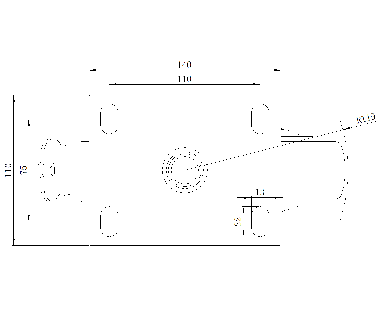 底板规格 140 x 110mm 底板孔距 110x75mm 底板孔径 22 x 13mm 偏心距 42mm 旋转干涉 238mm 总高 197mm 旋转半径 119mm 硬度 92±5° Shore A 荷重(动态) 670kgs |