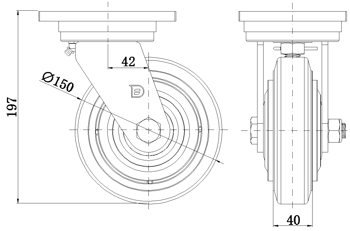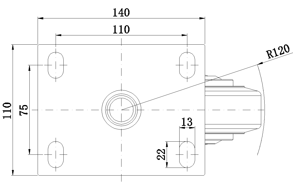 底板规格 140 x 110mm 底板孔距 110x75mm 底板孔径 22 x 13mm 偏心距 42mm 旋转干涉 240mm 总高 197mm 旋转半径 120mm 硬度 85±5° Shore A 荷重(动态) 300kgs |