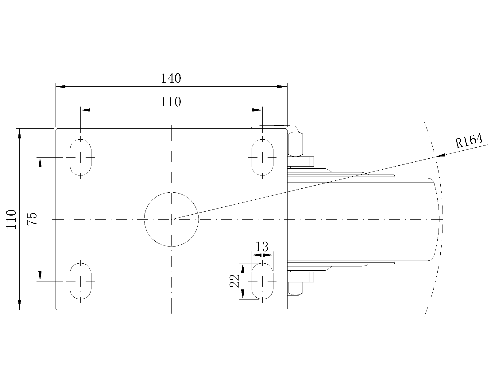 底板规格 140 x 110mm 底板孔距 110x75mm 底板孔径 22 x 13mm 偏心距 62mm 旋转干涉 328mm 总高 248mm 旋转半径 164mm 硬度 72±5° Shore D 荷重(动态) 400kgs |