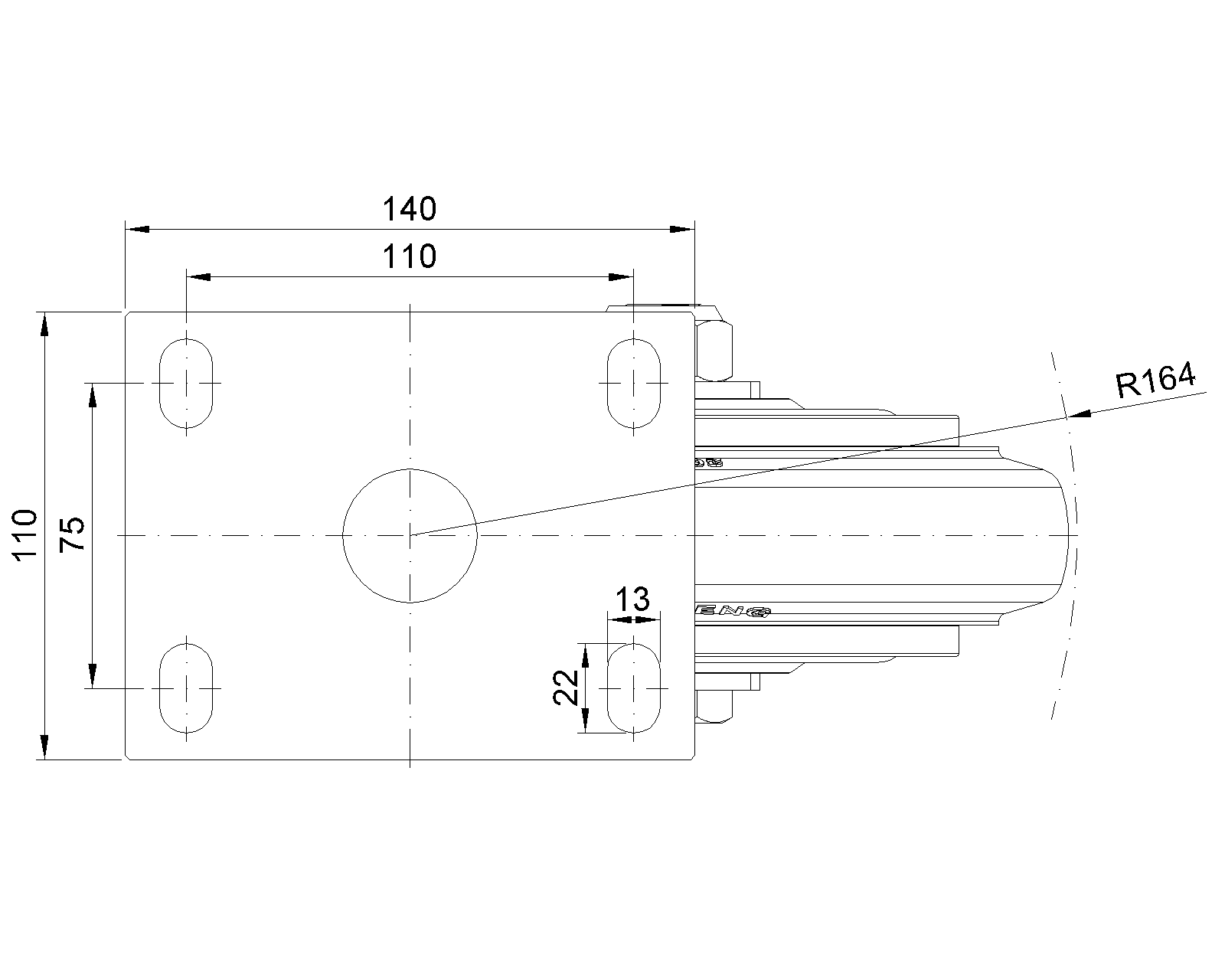 底板规格 140 x 110mm 底板孔距 110x75mm 底板孔径 22 x 13mm 偏心距 62mm 旋转干涉 328mm 总高 248mm 旋转半径 164mm 硬度 85±5° Shore A 荷重(动态) 350kgs |