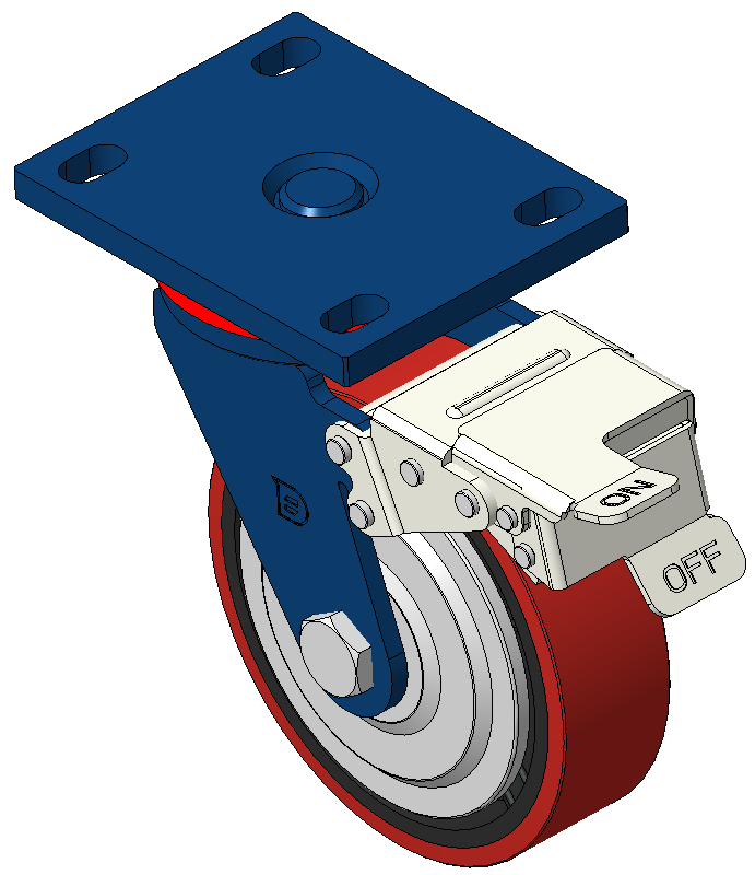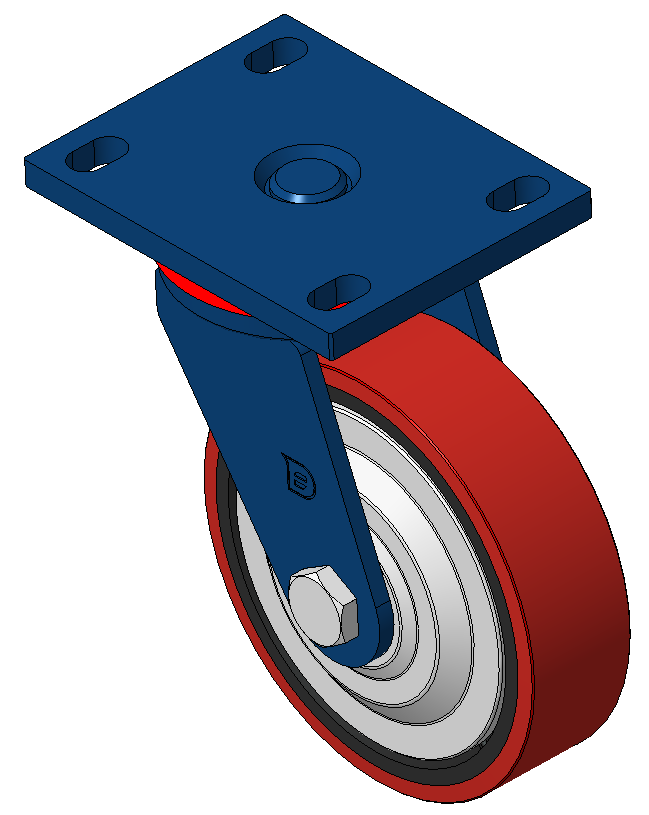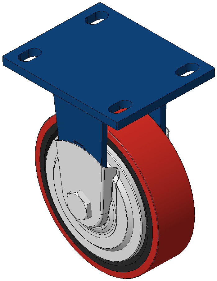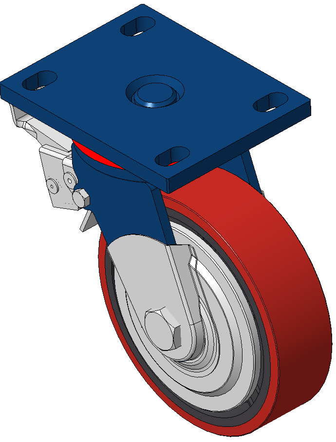 表面喷蓝漆,底板式安装装置,孔距110x75 铸铁制轮芯,高质量聚氨酯轮面,铣红色 轮子轴承—精密滚珠 |