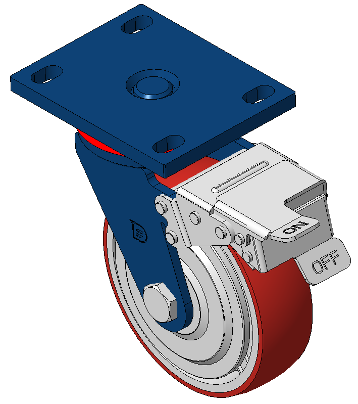 表面喷蓝漆,底板式安装装置,孔距110x75 铸铁制轮芯,高质量聚氨酯轮面,铣红色 轮子轴承—精密滚珠 |