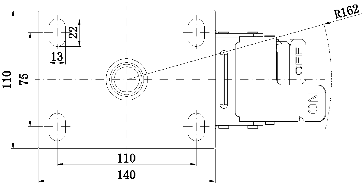 底板规格 140 x 110mm 底板孔距 110x75mm 底板孔径 22 x 13mm 偏心距 42mm 旋转干涉 324mm 总高 197mm 旋转半径 162mm 硬度 72±5° Shore D 荷重(动态) 350kgs |
