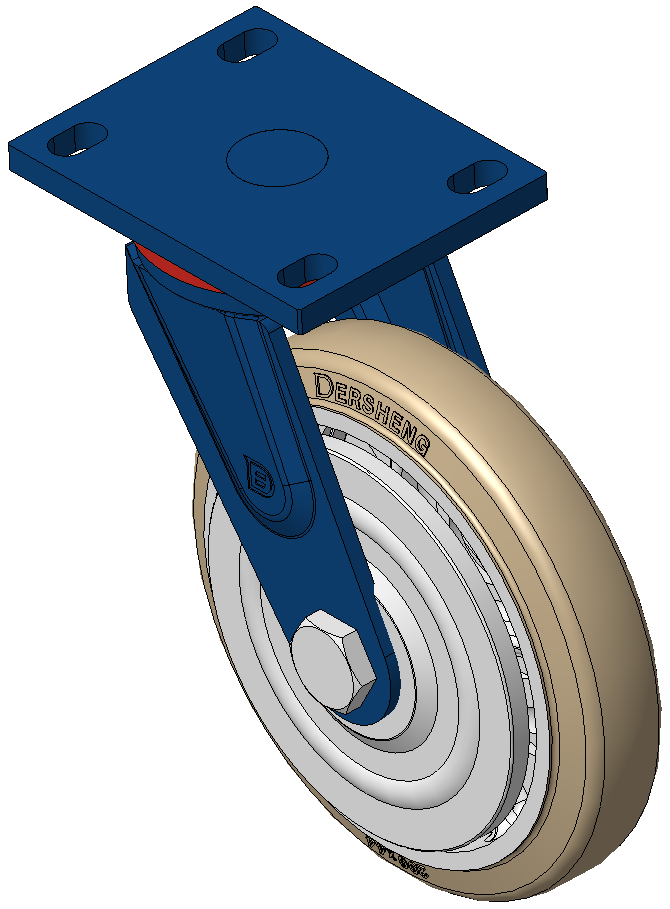 固定式脚轮,焊接钢板架 表面蓝漆,底板式安装装置,孔距110x75 铸铁制轮芯,高品质高弹性橡胶轮面,铣原色 轮子轴承—精密滚珠 |