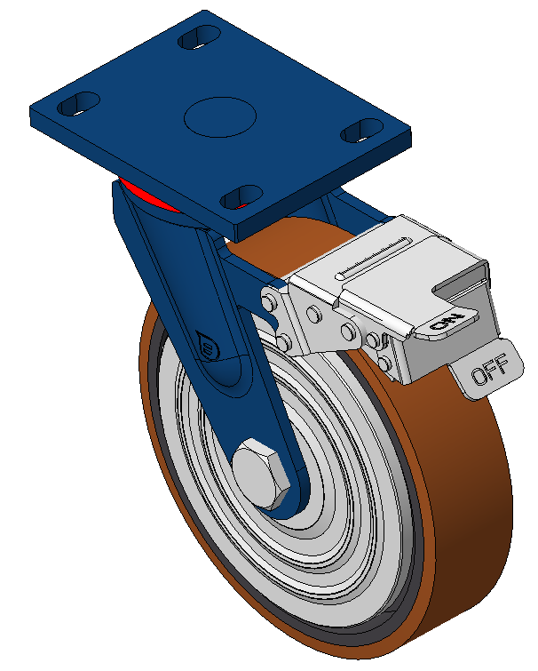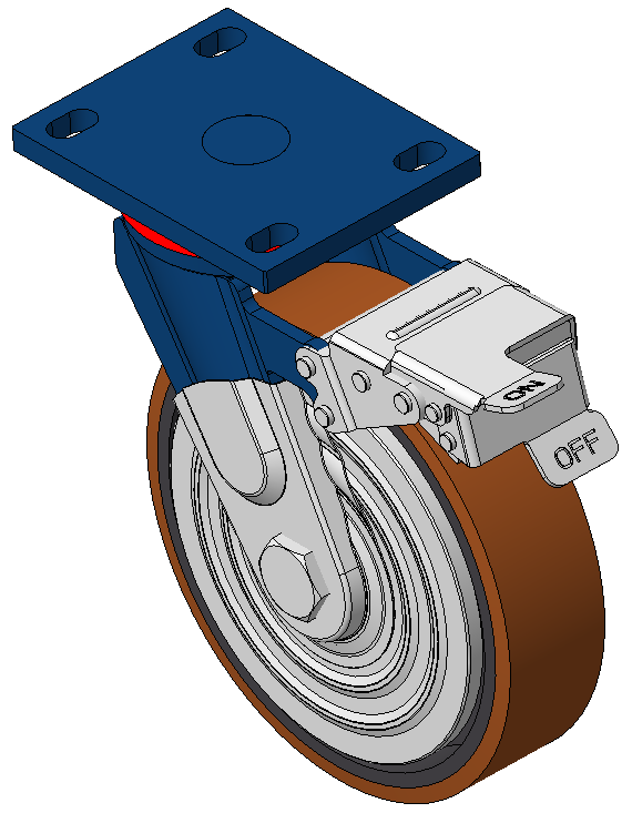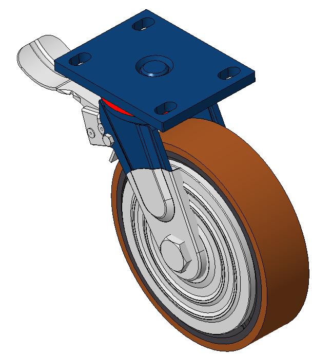 Casters with rear brake and With locking system, Welded Caster Fork Blue-painted finish, Mounting Type - Top Plate, 110x75 Bolt Hole Spacing Cast Iron Wheel Center, High Quality Polyurethane Wheel Tread, Cast Iron brown Bearings—Ball Bearings |