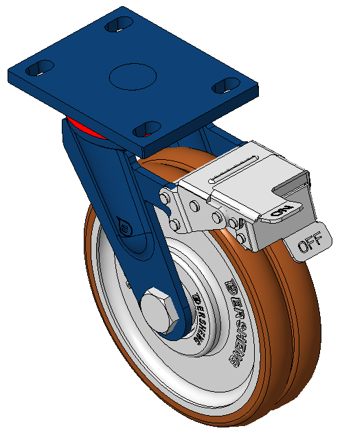| 固定式腳輪,焊接鋼板架,表面噴藍漆 底板式安裝裝置,孔距110x75 鑄鐵製輪芯,高品質聚氨酯輪面,銑褐色 輪子軸承—特製的精密滾珠,降低運轉阻力 ZQPU雙輪,符合人體工學,更容易啟動、轉動 |