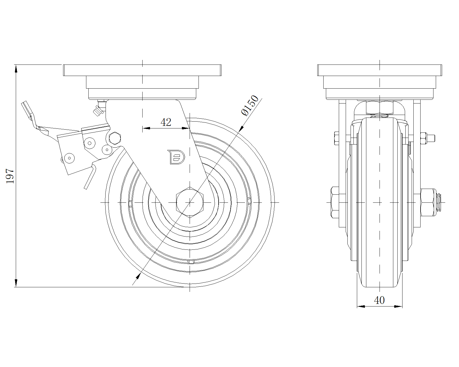 | 配有後煞式,鎖定系統的腳輪,焊接鋼板架 表面噴藍漆,底板式安裝裝置,孔距110x75 鑄鐵製輪芯,高品質高彈性橡膠輪面,銑原色 輪子軸承—精密滾珠 |