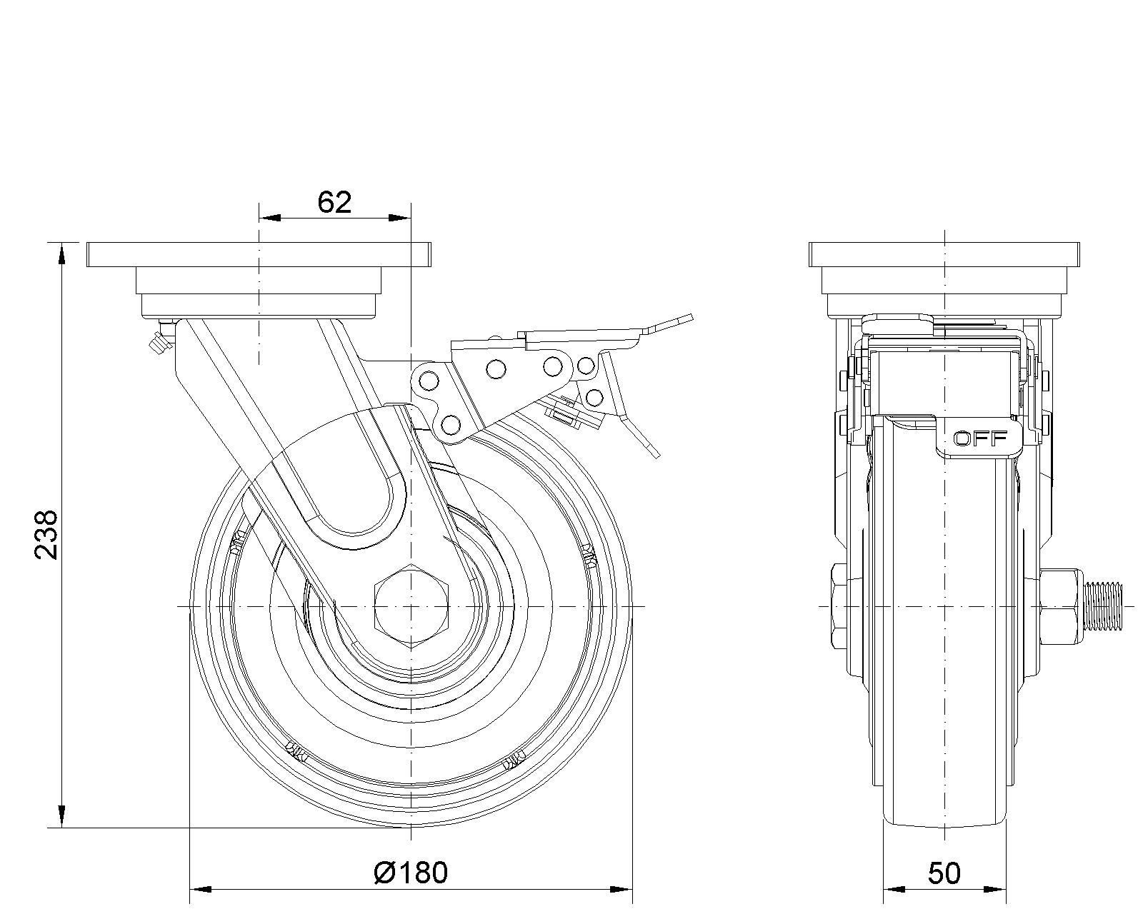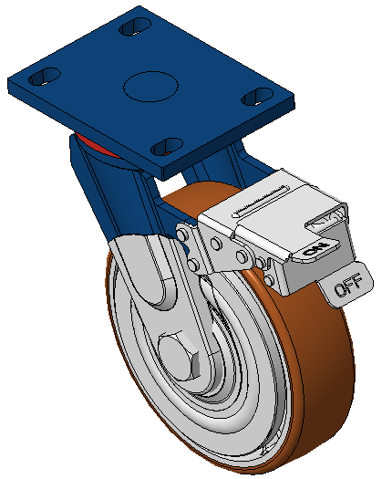 前煞車式的腳輪,焊接鋼板架 表面藍漆,底板式安裝,孔距110x75 鐵製輪芯,高品質高彈性橡膠輪面,銑褐色 輪子軸承—精密滾珠,配特製防纏繞蓋 |