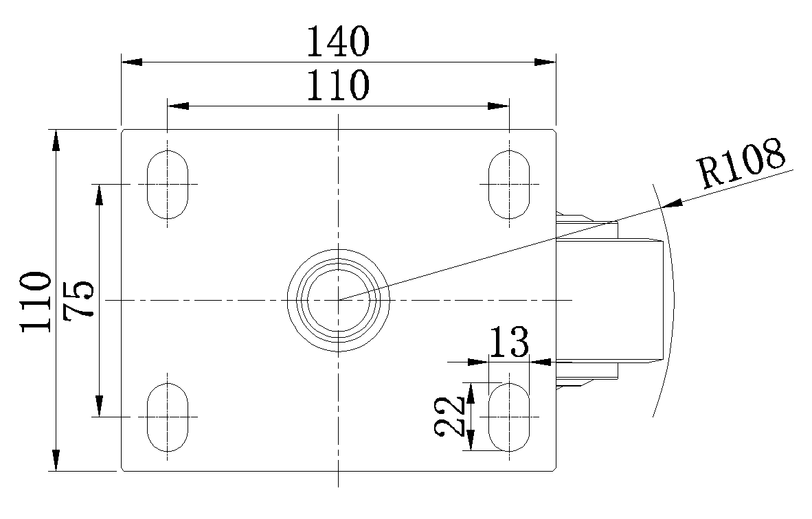 Quy cách tấm lắp 140 x 110mm khoảng cách các lỗ trên tấm nền 110x75mm Khoảng cách các lỗ lắp 22 x 13mm Độ lệch tâm 42mm Sự can thiệp quay 216mm Tổng chiều cao 170mm Bán kính xoay 108mm Độ cứng 92±5° Shore A Tải trọng (động) 500kgs |
