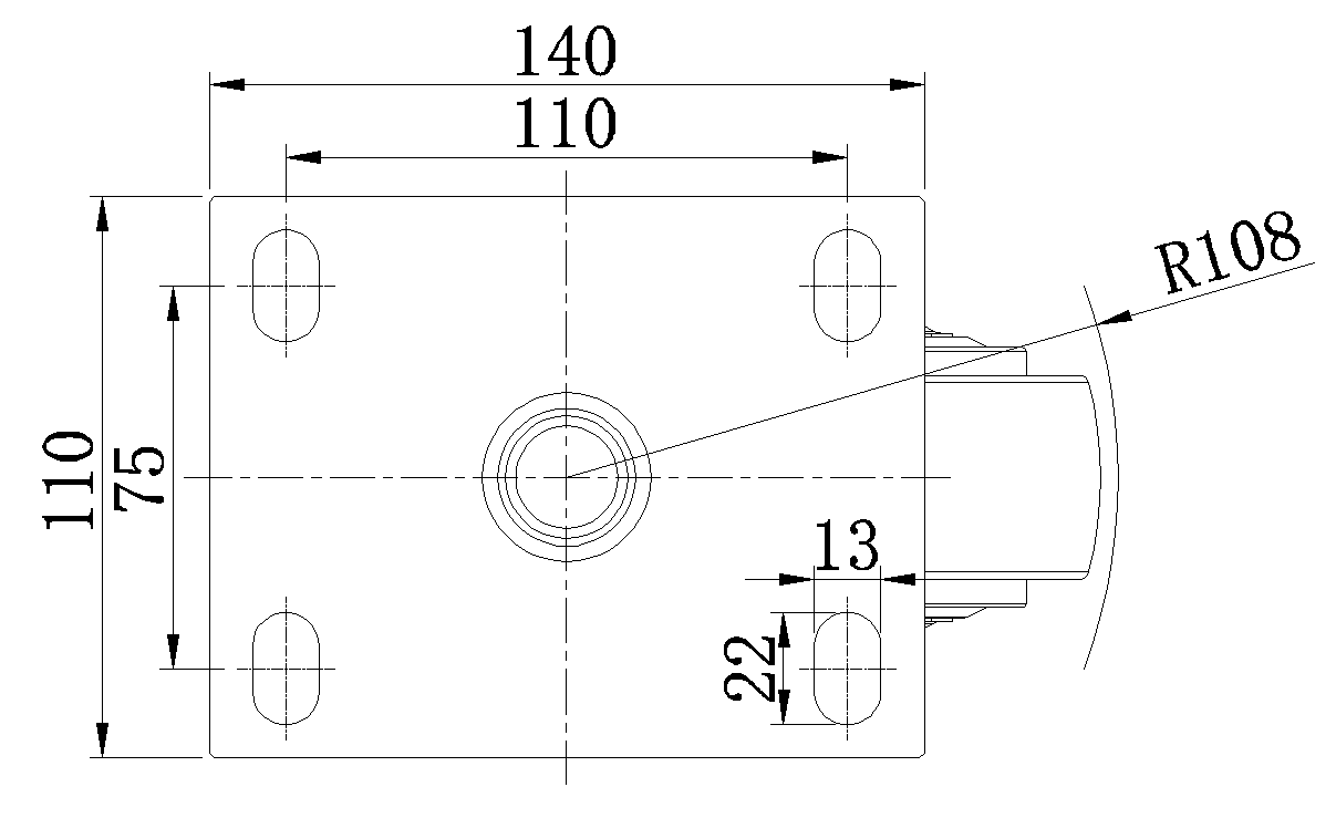 Quy cách tấm lắp 140 x 110mm khoảng cách các lỗ trên tấm nền 110x75mm Khoảng cách các lỗ lắp 22 x 13mm Độ lệch tâm 42mm Sự can thiệp quay 216mm Tổng chiều cao 170mm Bán kính xoay 108mm Độ cứng 75±5° Shore D Tải trọng (động) 300kgs |