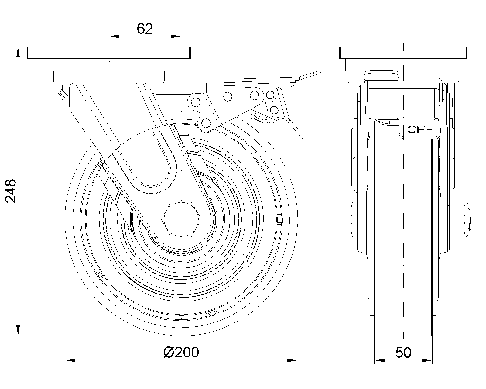 Bánh xe có phanh trước và hệ thống khóa, khung thép hàn Hoàn thiện sơn xanh, lắp đế, khoảng cách lỗ 110x75 Lõi bánh xe bằng gang, gai polyurethane chất lượng cao, phay màu đỏ Vòng bi bánh xe—vòng bi chính xác với nắp bánh xe chống quấn đặc biệt |