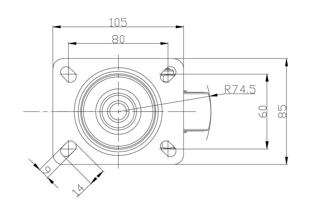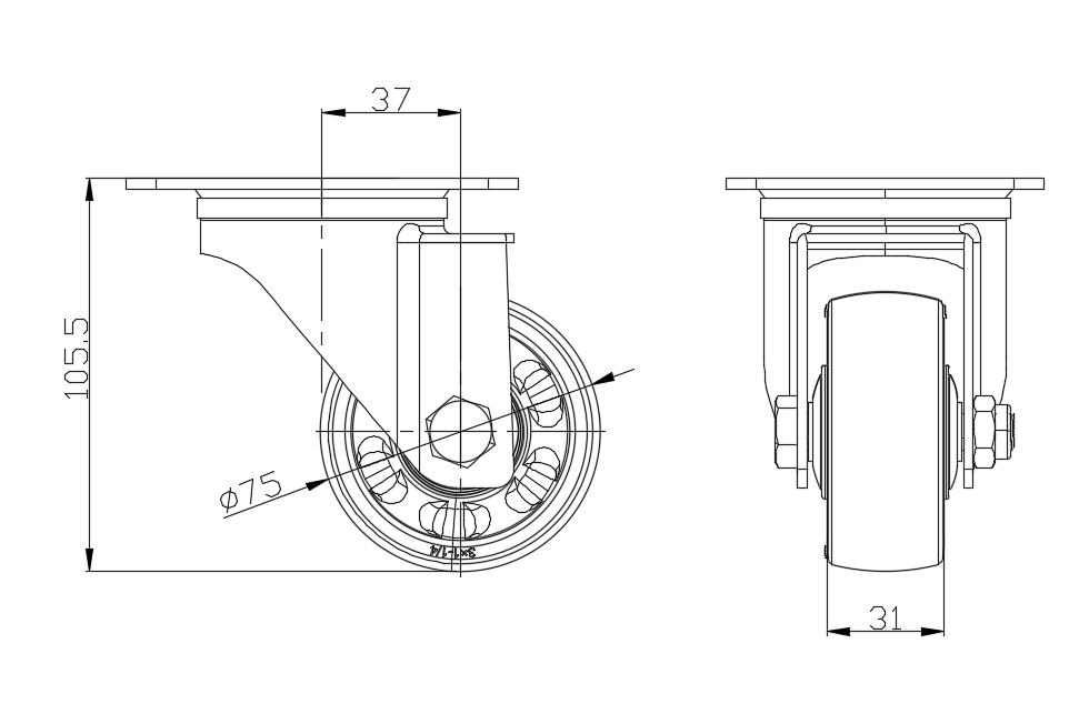 Bề mặt mạ kẽm, thiết bị lắp tấm đế Lõi bánh xe và bề mặt bánh xe bằng nhựa nhiệt dẻo gia cố Vòng bi bánh xe - vòng bi bi chính xác. |
