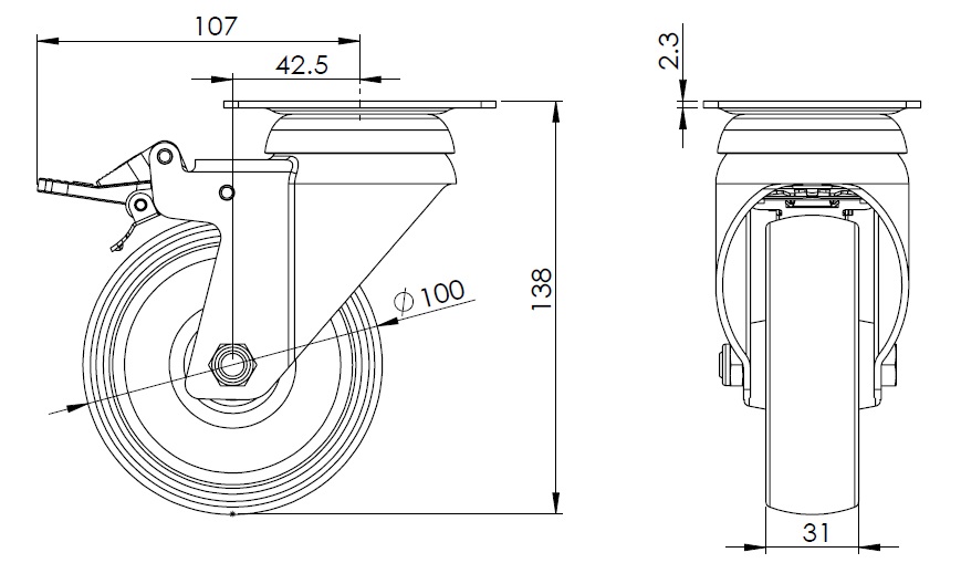 | 配有雙煞式,鎖定系統的腳輪。底板鉚合沖壓腳架—儀器孔 表面鍍鋅,底板式安裝裝置 熱可塑性塑膠輪芯、輪面 輪子—中管式。 |