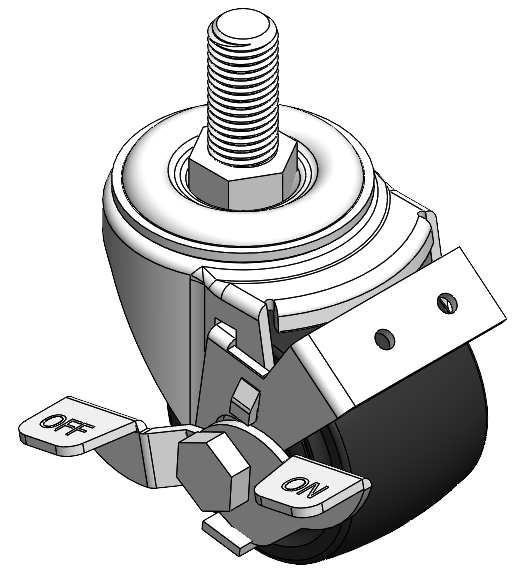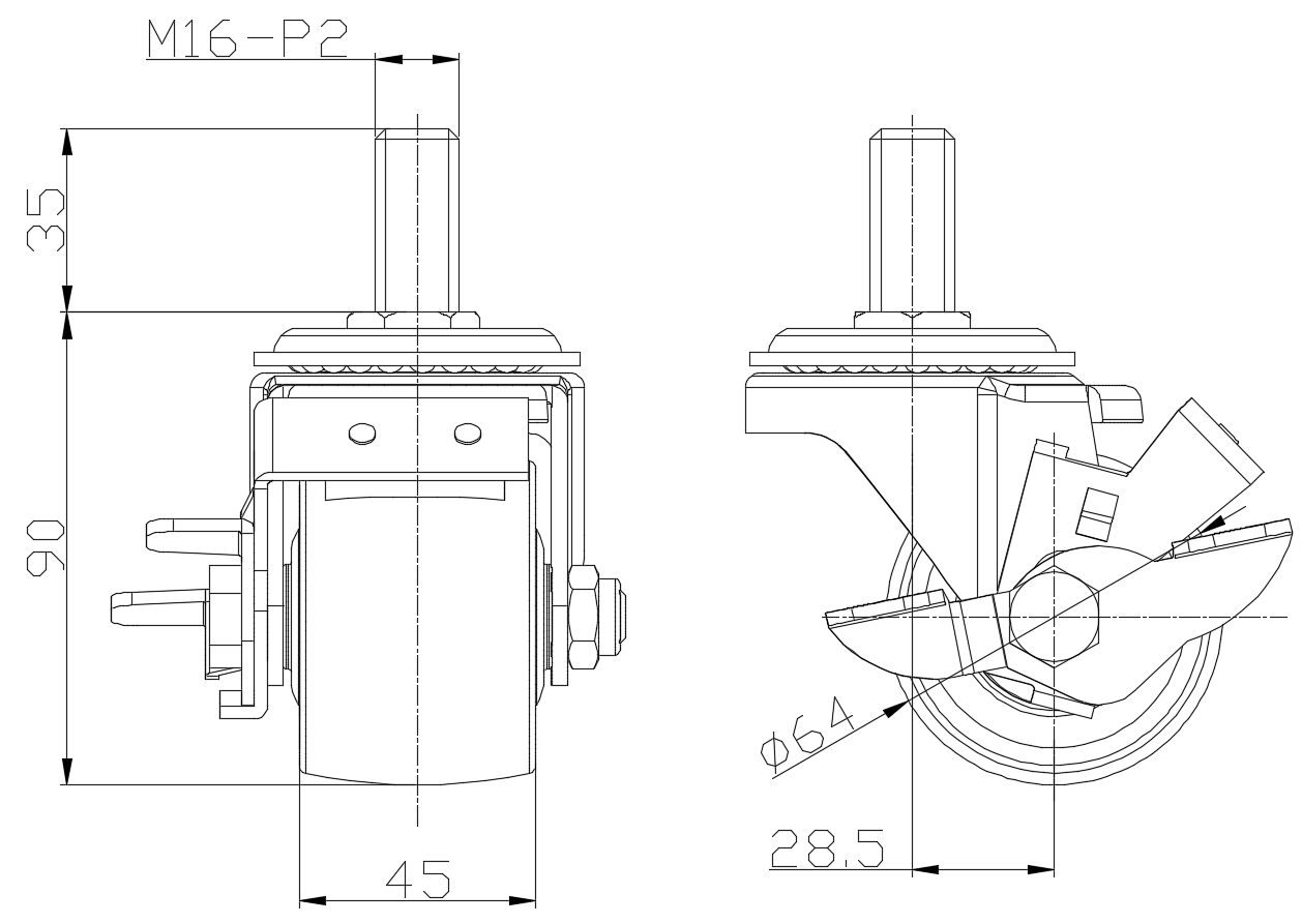 | 配有侧(轮)煞式,锁定系统的脚轮。牙心铆合冲压脚架—M16-P2