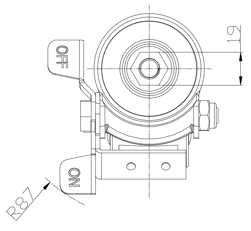 丝扣规格 M16-P2 丝扣长度 35mm 偏心距 28.5mm 旋转干涉 174mm 总高 90mm 旋转半径 87mm 硬度 75±5° Shore D 荷重(动态) 250kgs |