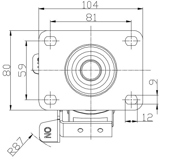 底板规格 104 x 80mm 底板孔距 81 x 59mm 高级孔 底板孔径 12 x 9mm 偏心距 31mm 旋转干涉 174mm 总高 102mm 旋转半径 87mm 硬度 75±5° Shore D 荷重(动态) 300kgs |