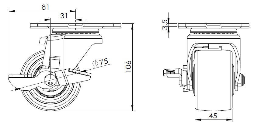 Castors with Side Brakes and Locking system. Top Plate Riveted Stamping Fork Surface Zine-Plated, Mounting Type - Top Plate Reinforced Polypropylene and Wheel Tread Bearing - Ball Bearing. |