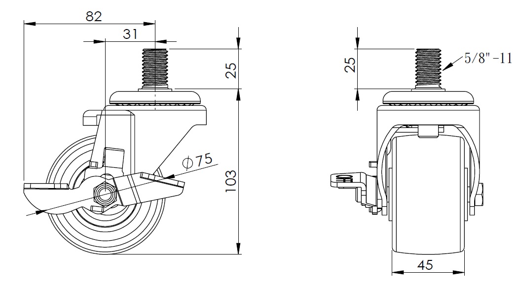 Casters with Side Brakes and With locking system. Threaded Stem Riveted Pressed Fork – 5/8-11 threads.