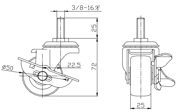 Casters with Side Brakes and With locking system. Threaded Stem, Riveted Stamping Fork—3/8"-16 thread.