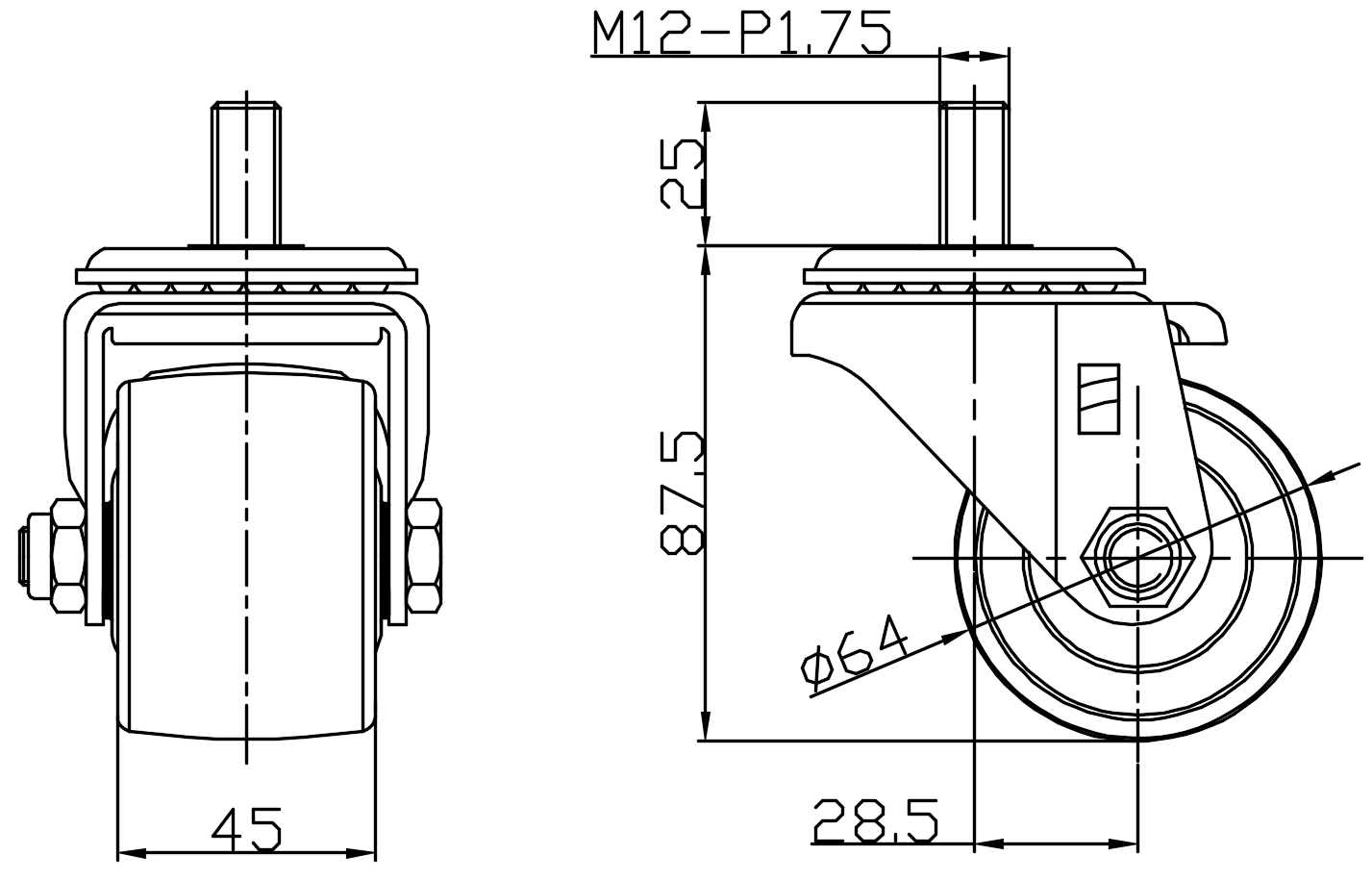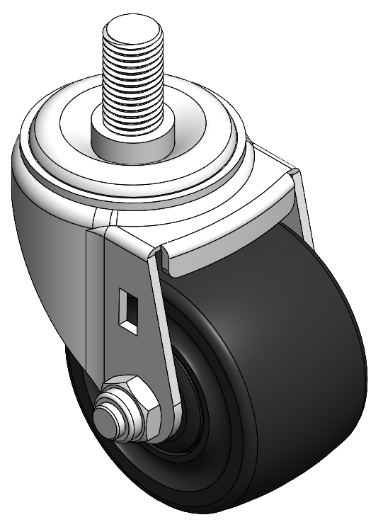 Swivel Caster, thread-Riveted Stamping Fork—M12-P1.75 Zine-Plated, Mounting Type - Threaded Stem Thermoplastic core and tread Bearing—Ball Bearing. |
