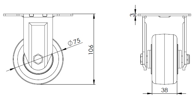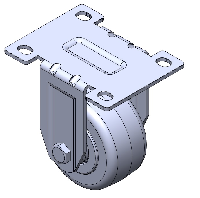 | 固定式腳輪,一體成型沖壓腳架 表面鍍鋅,底板式安裝裝置 浸軟織物的壓縮合成樹脂輪芯、輪面 輪子—精密長珠軸承。 |