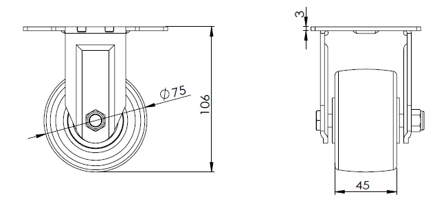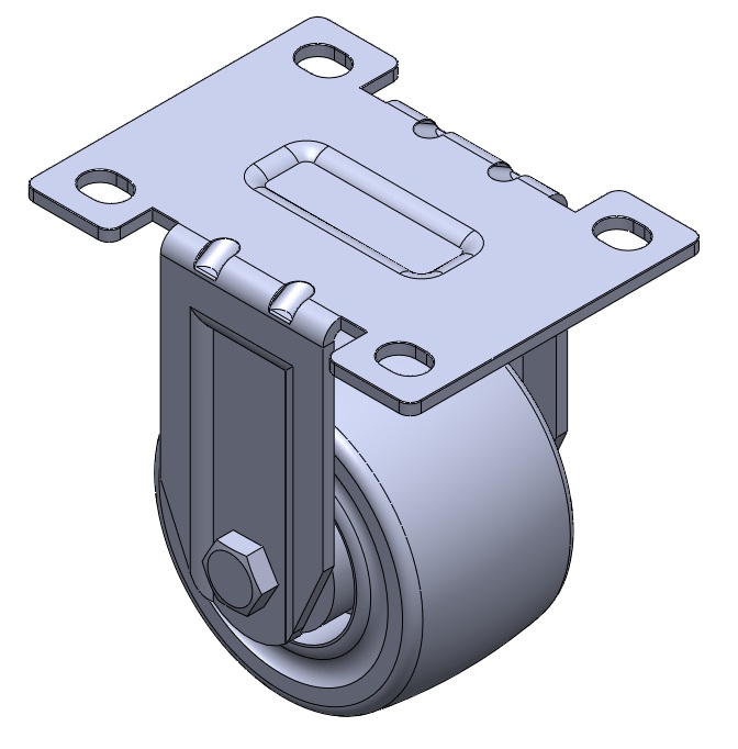 | 固定式腳輪,一體成型沖壓腳架 表面鍍鋅,底板式安裝裝置 浸軟織物的壓縮合成樹脂輪芯、輪面 輪子—中管式。 |
