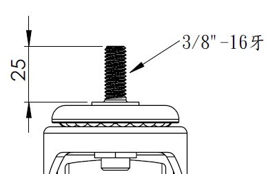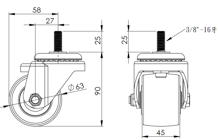 絲扣規格 3/8"-16牙 絲扣長度 25mm 偏心距 27mm 旋轉干涉 116mm 總高 90mm 旋轉半徑 58mm 硬度 75±5° Shore D 荷重(動態) 250kgs |