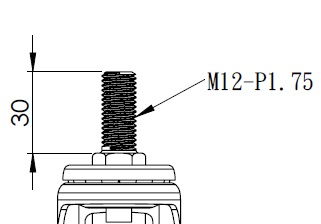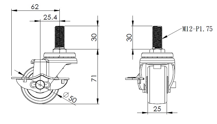 絲扣規格 M12-P1.75 絲扣長度 30mm 偏心距 25.4mm 旋轉干涉 124mm 總高 71mm 旋轉半徑 62mm 硬度 75±5° Shore D 荷重(動態) 70kgs |