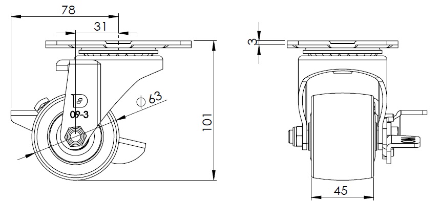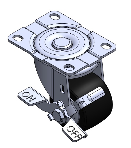 | 配有側(輪)煞式,鎖定係統的腳輪。底板鉚合沖壓腳架 表面鍍鋅,底板式安裝裝置 熱可塑性塑膠輪芯、輪面 輪子軸承—精密滾珠。 |