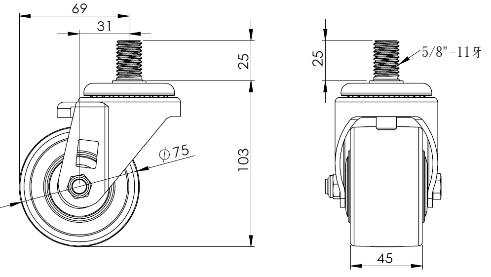 | 活動式腳輪,牙心鉚合沖壓腳架—5/8"-11牙