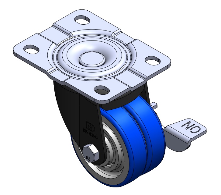 | 配有側(輪)煞式,鎖定係統的腳輪。底板鉚合沖壓腳架 底板鍍鋅,腳架電著,底板式安裝裝置 鑄鐵製輪芯,高品質聚氨酯輪面 藍色,輪子軸承—精密滾珠。 |