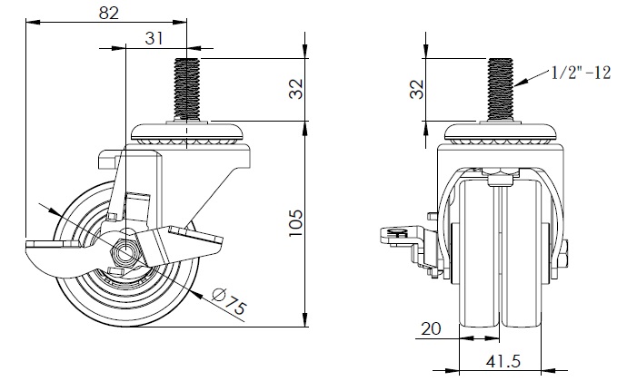 絲扣規格 1/2"-12牙 絲扣長度 32mm 偏心距 31mm 旋轉干涉 164mm 總高 105mm 旋轉半徑 82mm 硬度 87±5° Shore A 荷重(動態) 400kgs |