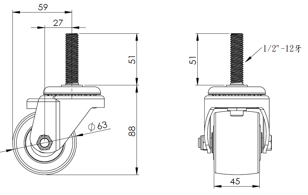 Bánh xe xoay, đế dập đinh tán - ren 1/2-12