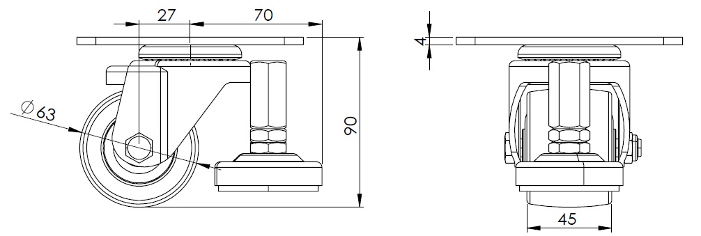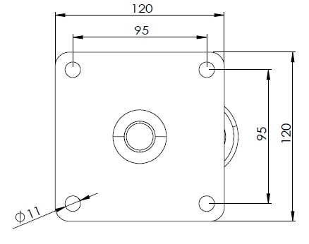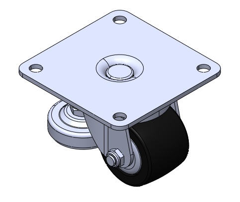 Bánh xe xoay với đế đinh tán và đế dập. Hoàn thiện mạ kẽm, lắp đế (có chân đỡ). Lõi và mặt đế bằng nhựa nhiệt dẻo. Vòng bi bánh xe: vòng bi bi chính xác. |
