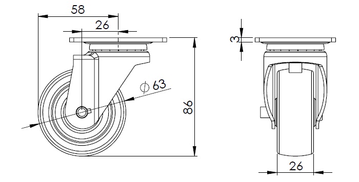 Bánh xe nylon Đường kính bánh xe × chiều rộng bánh xe 63 x 26mm |