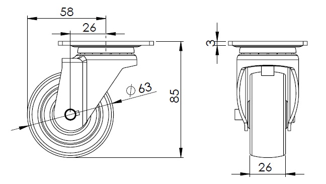 Bánh xe nylon Đường kính bánh xe × chiều rộng bánh xe 63 x 26mm |
