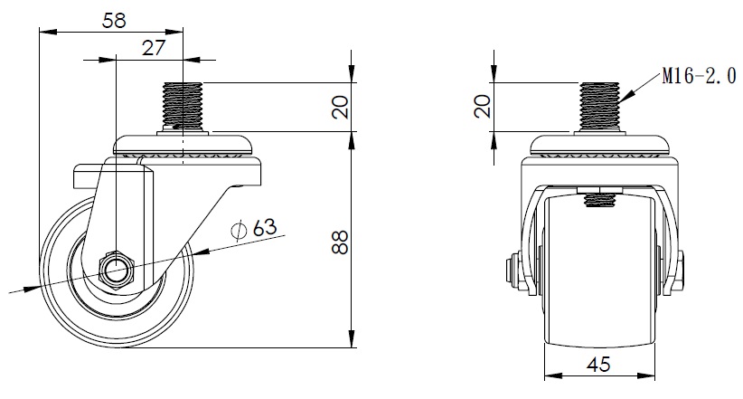 Bánh xe xoay, đế dập đinh tán ren—M16-2.0