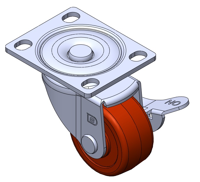 Bánh xe có phanh bên và hệ thống khóa. Đế bánh xe được tán đinh và dập. Hoàn thiện mạ kẽm, lắp đế bánh xe. Lõi bánh xe và gai bánh xe bằng nhựa nhiệt dẻo. Màu nâu đỏ. Bánh xe hình ống. |