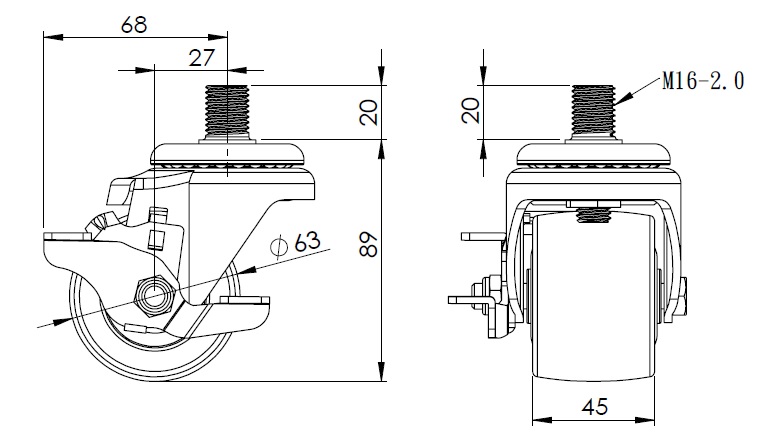 Bánh xe có phanh bên và hệ thống khóa. Chân dập đinh tán ren – M16-P2.0