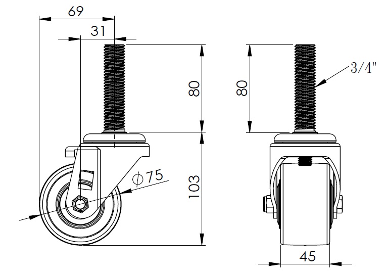 Bánh xe nylon Đường kính bánh xe × chiều rộng bánh xe 75 x 45mm |