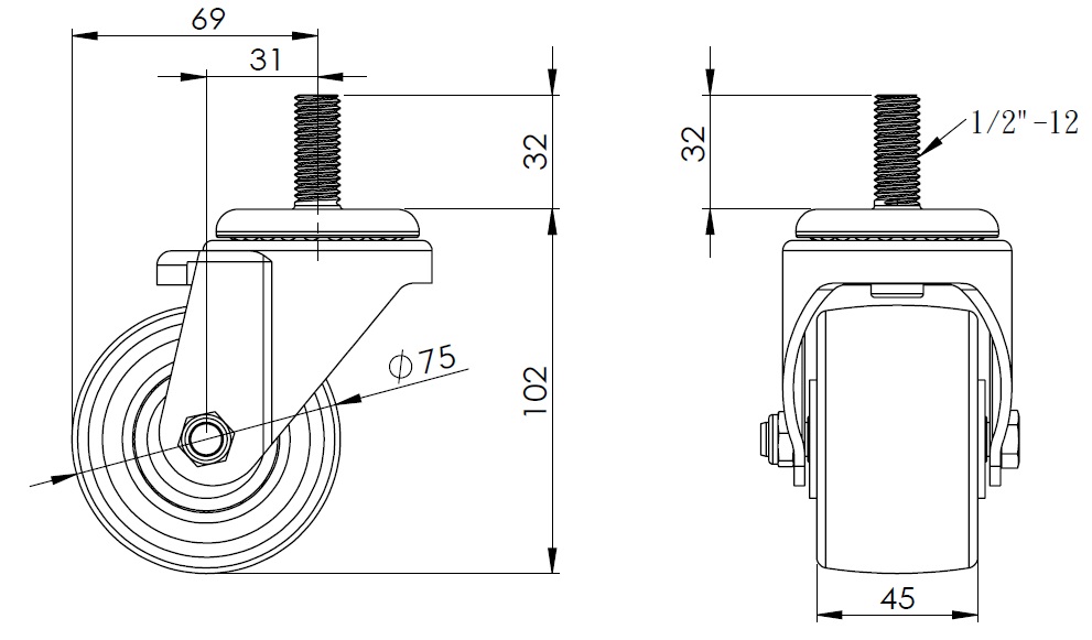 Bánh xe xoay, đế dập đinh tán - ren 1/2-12
